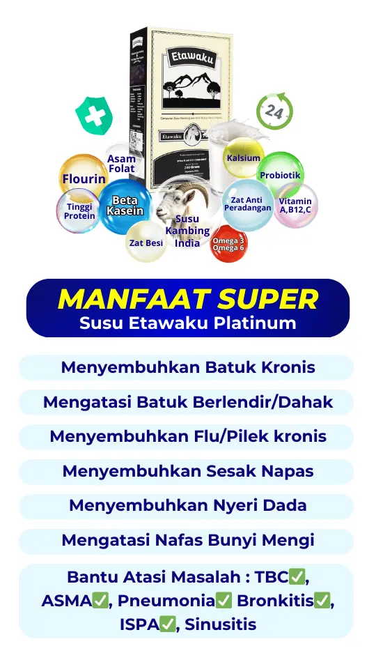 Susu Etawaku Platinum adalah susu formula SPESIALIS MASALAH PERNAFASAN. Mengandung Florin, Betakasein, Zinc, Vitamin A,D, dan B12, Selenium, dan Protein, bermanfaat untuk membantu meredakan gejala gangguan pernapasan, membersihkan paru-paru, serta meningkatkan sistem imun tubuh.